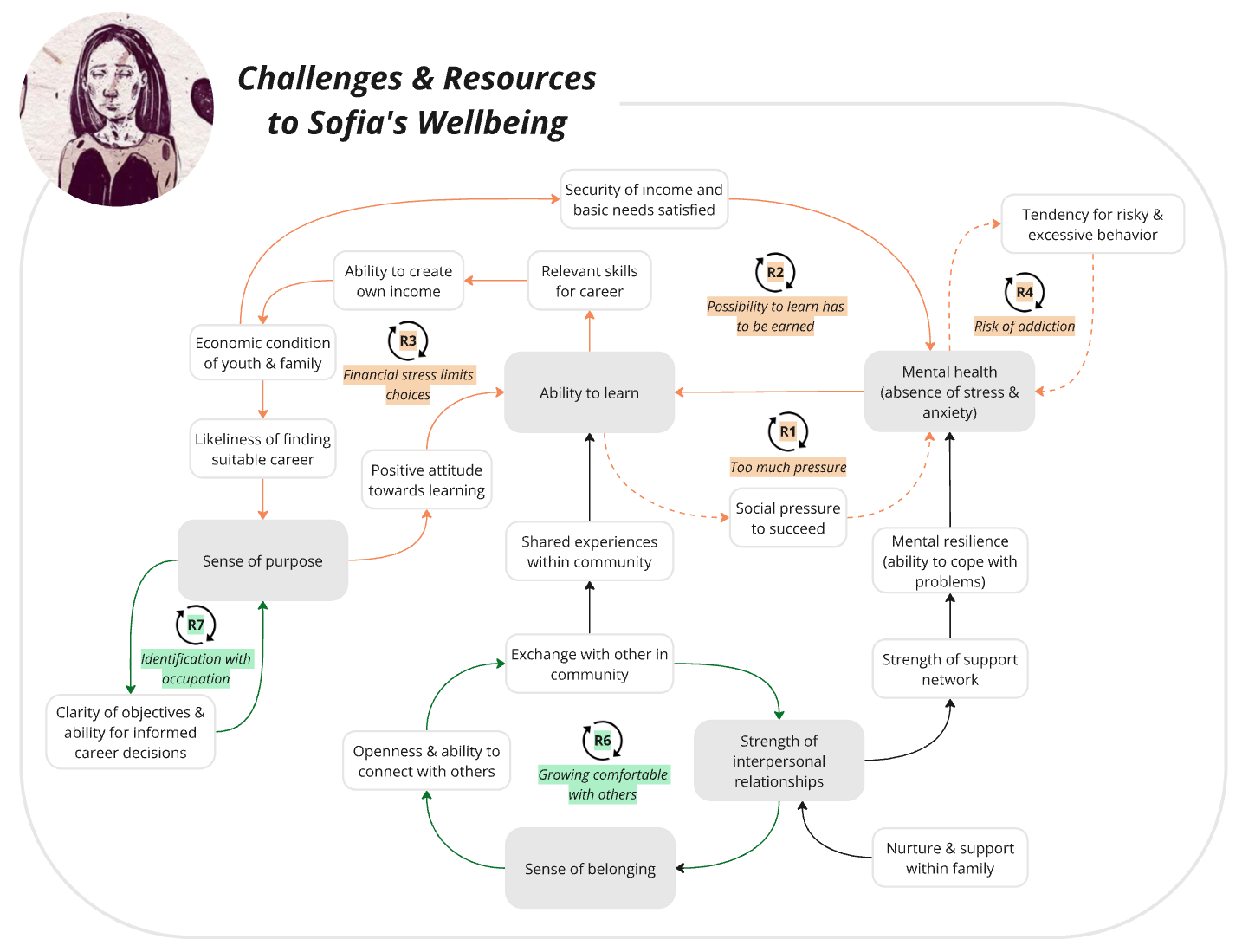 The System Map excerpt for Sofia is a small, more digestible slice of the whole map. It allows us to show both the vicious loops that might endanger her wellbeing and the virtuous loops that strengthen her capacity to overcome challenges — without asking viewers to process everything at once.